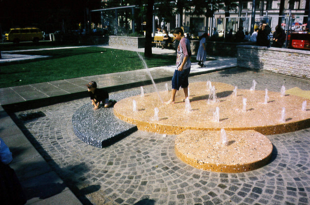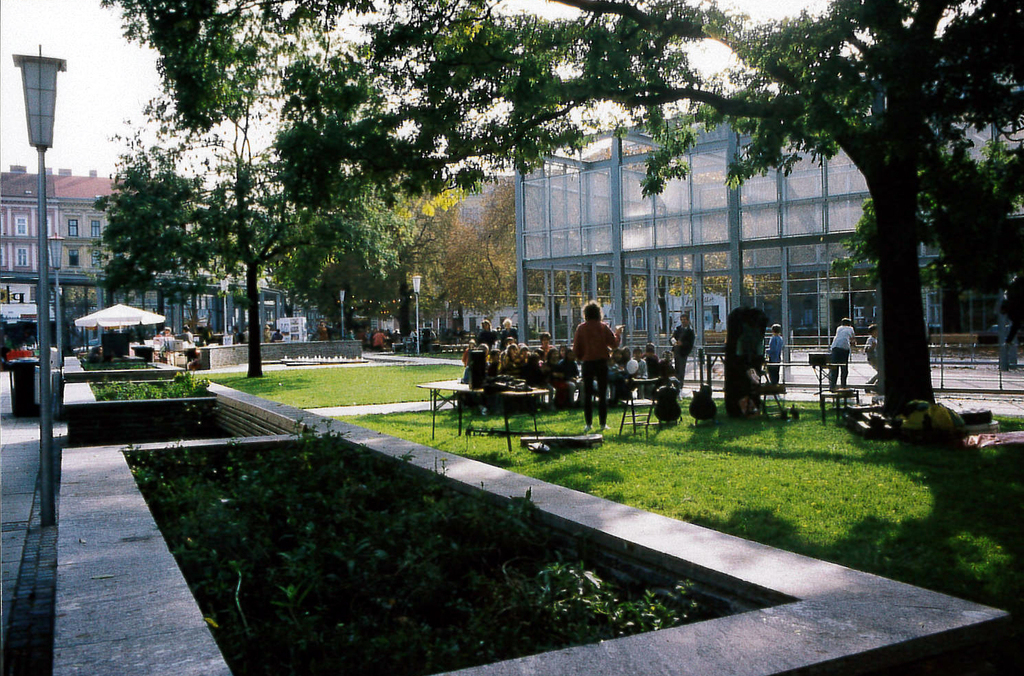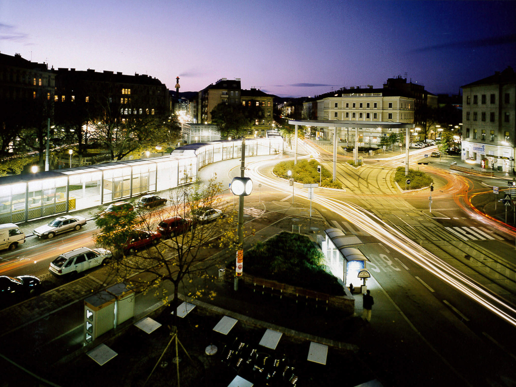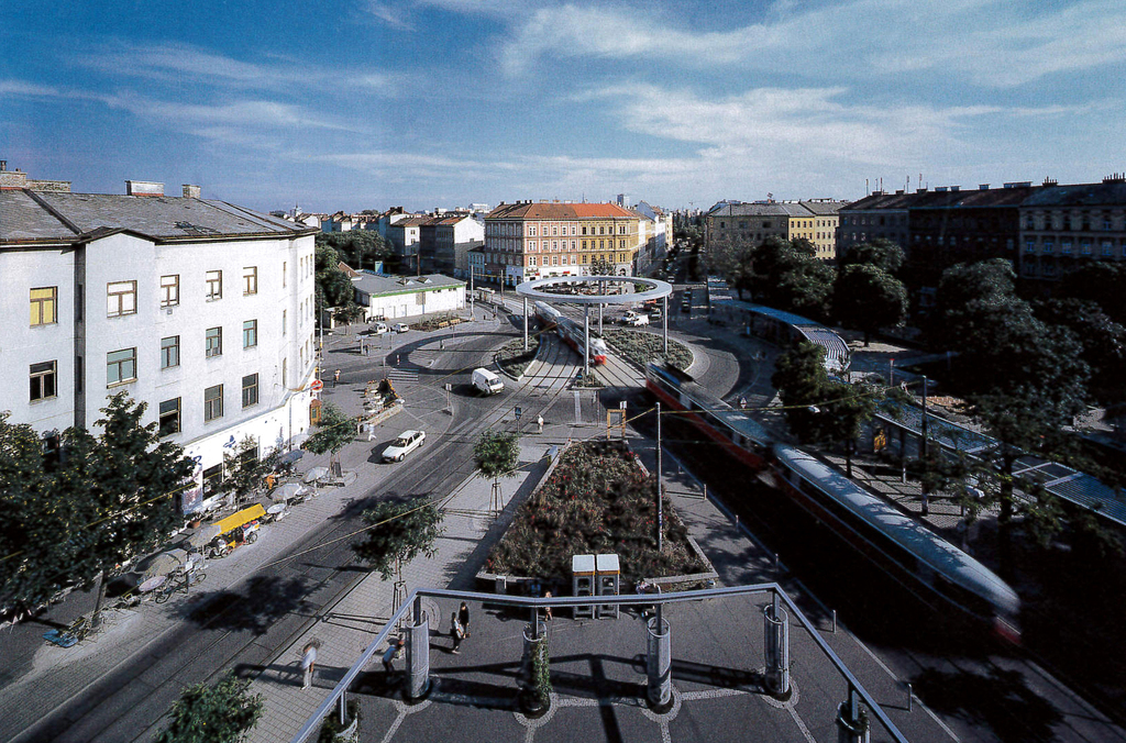 Der urbanistische Ansatz: Die Gleichbehandlung aller Nutzungen auf dem achteckigen Platz neben dem Augarten an der Grenze vom 2. zum 20. Bezirk. Ein neu geschaffener Kreisverkehr ermöglichte die Reduzierung der Fahrbahnen. Im Zentrum steht ein stählerner Ring mit 22m Durchmesser, der für die Ausleuchtung der Fahrbahnen sorgt und die Abspannseile der Oberleitungen für die Straßenbahnlinien aufnimmt. Eine begrünte Stahlpergola trennt die Fahrbahnen von der durch Zusammenlegung von Grünflächen entstandenen Parkanlage mit Ruhe- und Spielbereichen.