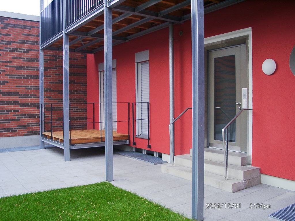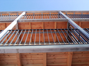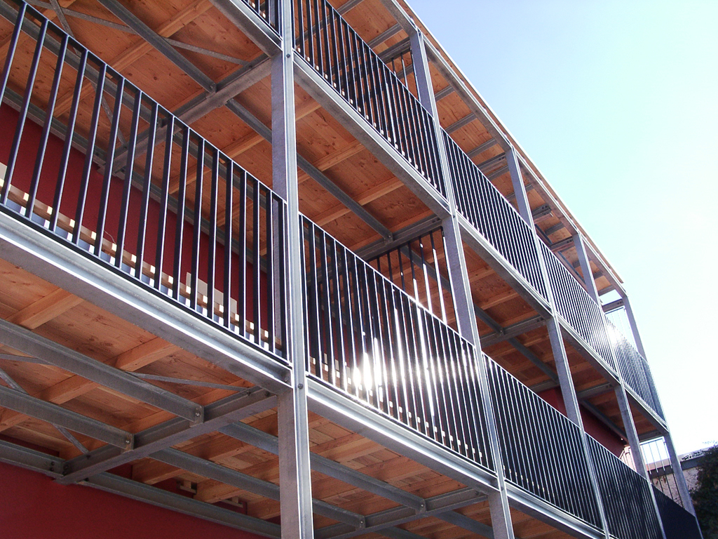 Gleich einem Möbel überformt ein dreigeschossiger Stahlbalkon die komplette Hofseite und stellt durch die Verwendung von Holz den Bezug zum alten Ortskern her.
