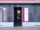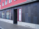 Die Vermögensberatung im Erdgeschoss dominiert durch seine bruchraue schwarze Schieferfassade mit einem Sockel aus schalungsglatten hellgrauen Sichtbetonfertigteilen. Die vier Wohnungen in den Obergeschossen erhalten einen kühl-dunkelroten Kratzputz.
