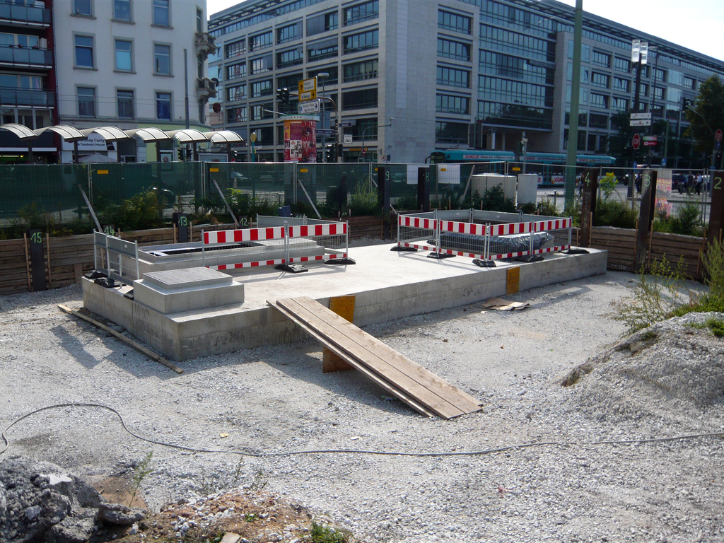 Im Vorfeld der Neugestaltung des Platzes wurde der Neubau einer unterirdischen Gasdruckregelstation erforderlich. In der aus WU-Beton erstellten hochtechnisierten Station befinden sich Räume für die Regelanlage sowie die Mess-, Steuerungs- und Regeltechnik. Sichtbar sind lediglich ein litfaßsäulengroßer Medienturm für die Zu- und Abluft, die Abwasserhebeanlage und die elektrotechnischen Steuerungen sowie drei LKW-befahrbare Gitterroste. Der Treppenrost ist hydraulisch öffenbar. Alle Teile sind TÜV-geprüfte Einzelanfertigungen.